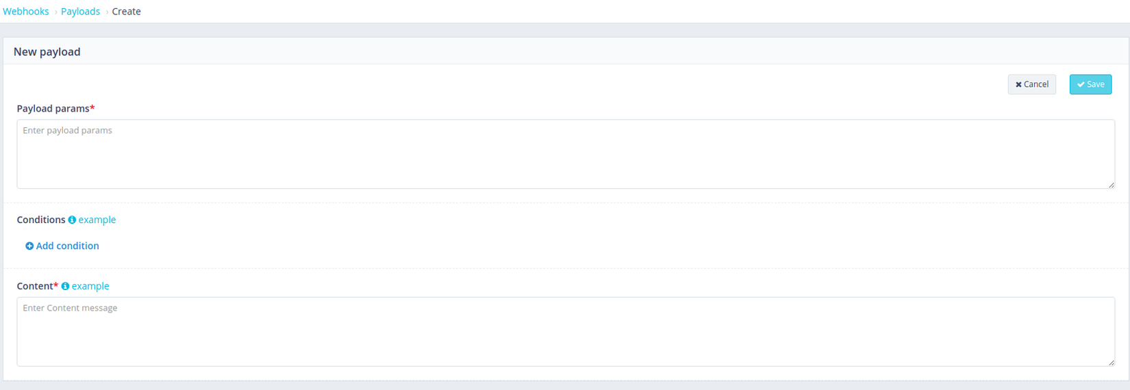 Đây là phần quan trọng nhất cho phép config payload, điều kiện và content cần gửi lên chatwork, tại mỗi phần sẽ có example (màu xanh) để cho các bạn dễ hiểu.