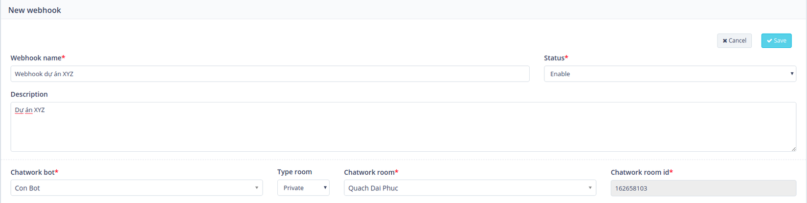 Ví dụ mình sẽ tạo webhook cho dự án XYZ để gửi message check Pull Request mỗi khi có member gửi Pull. Sử dụng con bot đã tạo lúc đầu và TO đến chính mình (Nếu muốn TO lên room bạn có thể chọn type room là Group thay vì Private )