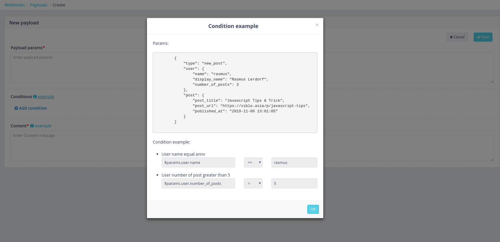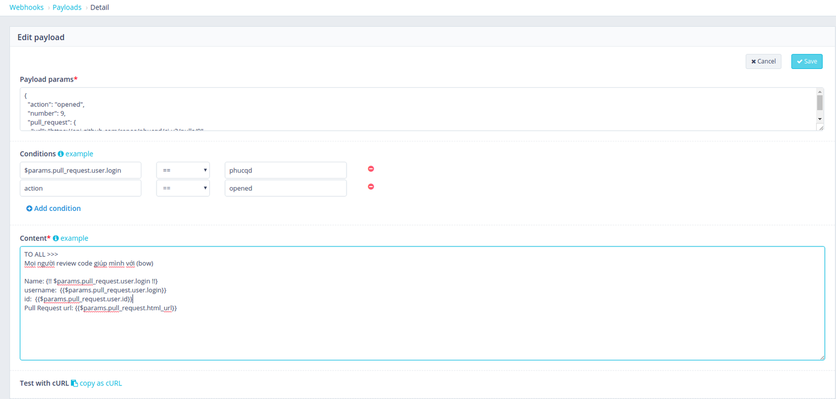Sau khi copy phần payload mẫu của một PR, chúng ta sẽ paste vào input Payload params. Các phần condition và content chúng ta có thể làm theo example sao cho hệ thống có thể tìm và đọc được dữ liệu bạn muốn lấy trong payload đã paste vào ở trên. ví dụ: