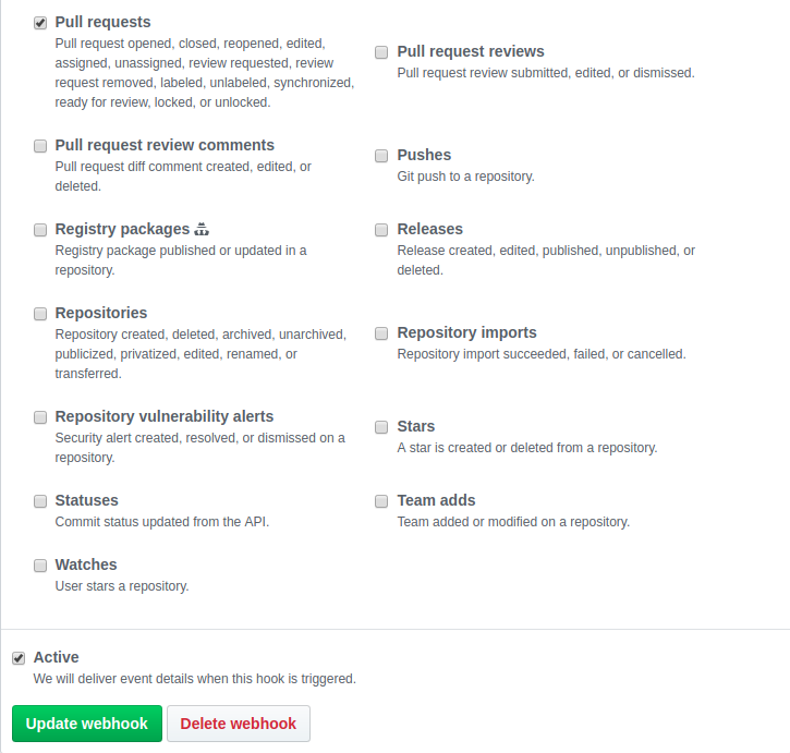 Để nhận được payload mỗi khi có Pull Request chúng ta cần check chọn vào event Pull requests trong setting của github.