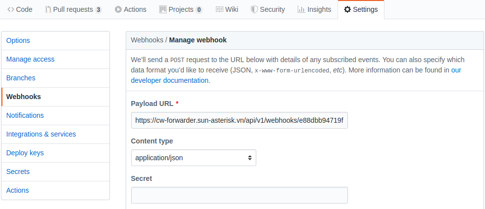 Url chính webhook được tạo ra để cung cấp cho các dịch vụ mà chúng ta muốn nhận được payload. copy url này và vào phần setting webhook trên github dự án (Chỉ quyền admin dự án mới vào được phần setting này)
