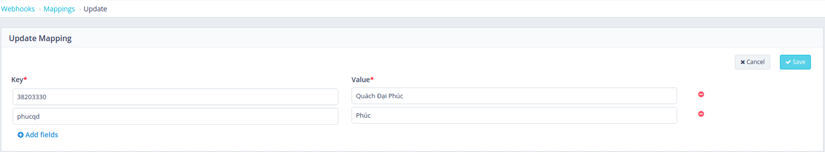 Đây là phần có tác dụng giúp bạn convert dữ liệu từ value này sang value khác, hiểu đơn giản như ví dụ trên chúng ta có user id là 38203330, tuy nhiên bạn không muốn hiển thị như vậy mà muốn thay vì là 38203330 sẽ hiển thị là Quách Đại Phúc. Đơn giản chỉ cần config trong phần mapping như sau: