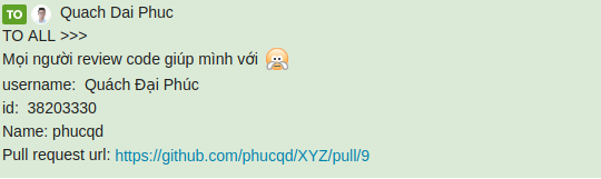 Như vậy là sau khi save lại và chờ đợi khi có một PR , chúng ta sẽ nhận được message TO đến chatwork