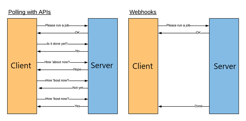 Ví dụ bạn đang muốn tạo một app có thể nhận được thông tin mỗi khi có thông báo, tin nhắn trên facebook. Vậy làm sao để ứng dụng của bạn có thể biết được mỗi khi có tin nhắn hay noti từ facebook? Theo cách thông thường thì bạn phải liên tục gửi request thăm dò đến facebook? Như vậy thì thật phiền phức và làm "tốn sức" của chính cái app mà bạn đang phát triển. Vậy nếu sử dụng webhook thì sao? Lúc này server-side chính là facebook, và app của bạn sẽ là client-side. Thay vì liên tục hỏi hay bật channel để "lắng nghe", facebook sẽ trả về thông tin của noti, tin nhắn cho app của bạn. Đỡ tốn "calo" nhỉ?