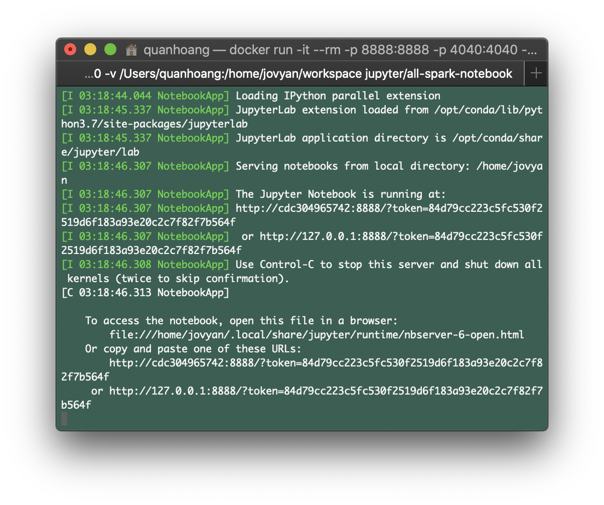 docker run -it --rm -p 8888:8888 -p 4040:4040 -v ~:/home/jovyan/workspace jupyter/all-spark-notebook