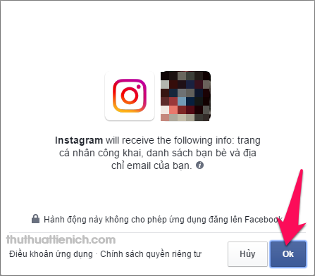 Do Instagram sử dụng thông tin từ Facebook, màn hình đang đưa ra đề nghị cấp quyền access Facebook của người dùng. Vì việc tự ý sử dụng thông tin người dùng không được cho phép, ứng dụng bắt buộc phải xin được cấp quyền từ người dùng.