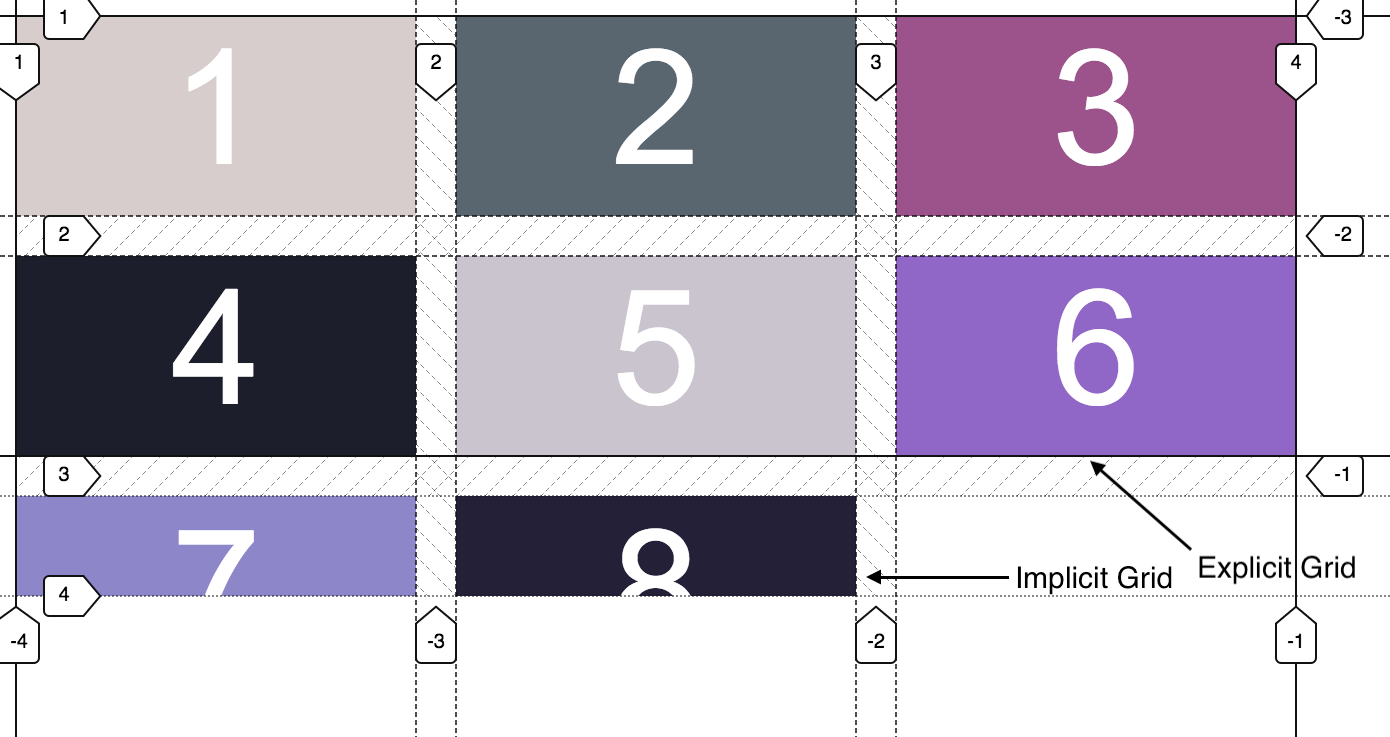 Grid chỉ có thể phát triển theo 1 hướng, vì vậy nó chỉ thêm hàng (row) hoặc cột (column). Kết quả là chỉ 1 trong những tính chất trên là có hiệu quả. Và bạn có thể thay đổi hướng của Implicit grid theo ý thích của mình bằng việc sử dụng thuộc tính grid-auto-flow