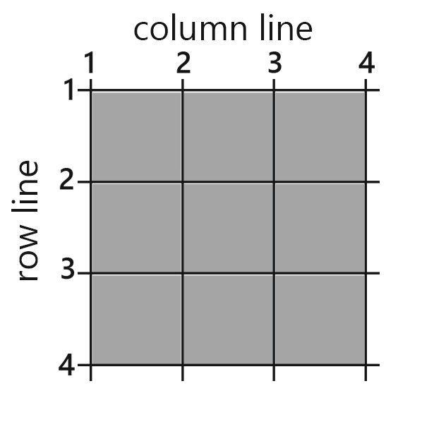 Trước khi tiếp tục, chúng ta cần tìm hiểu khái niệm grid lines. Với CSS grid, các đường nằm giữa các cột được gọi là column line, trong khi các đường nằm giữa các hàng được gọi là row line.