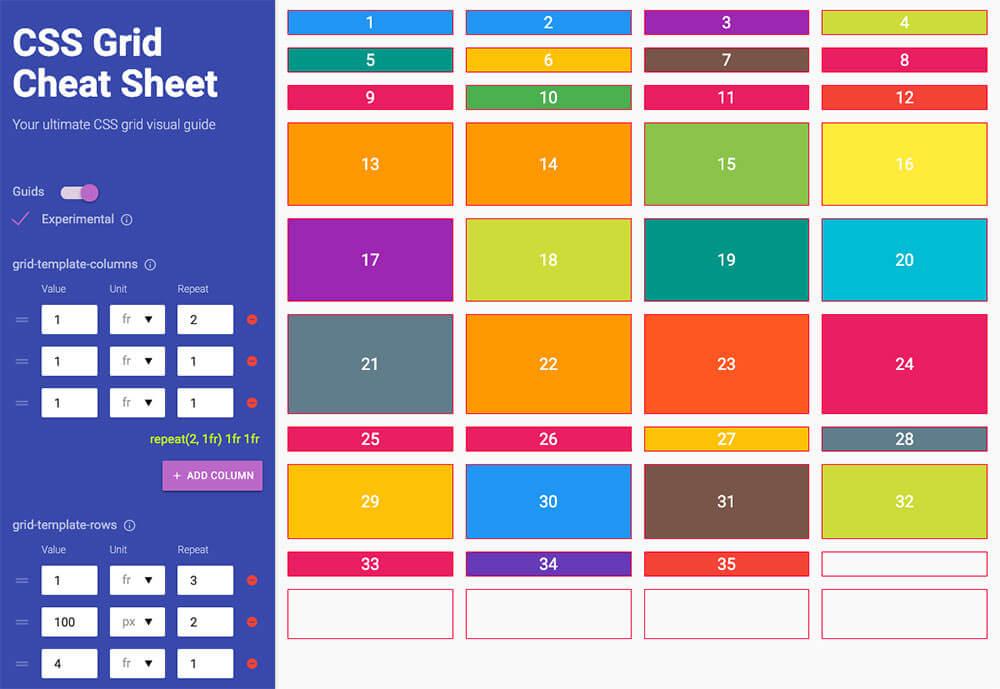 Đây là trang cũng giúp chúng ta học grid với preview trực quan nhưng có thêm màu sắc cho các grid giúp chúng ta dễ phân biệt và khi click vào các ô nó sẽ hiện các option giúp chúng ta có thể thay đổi các thuộc tính ở bên trái.