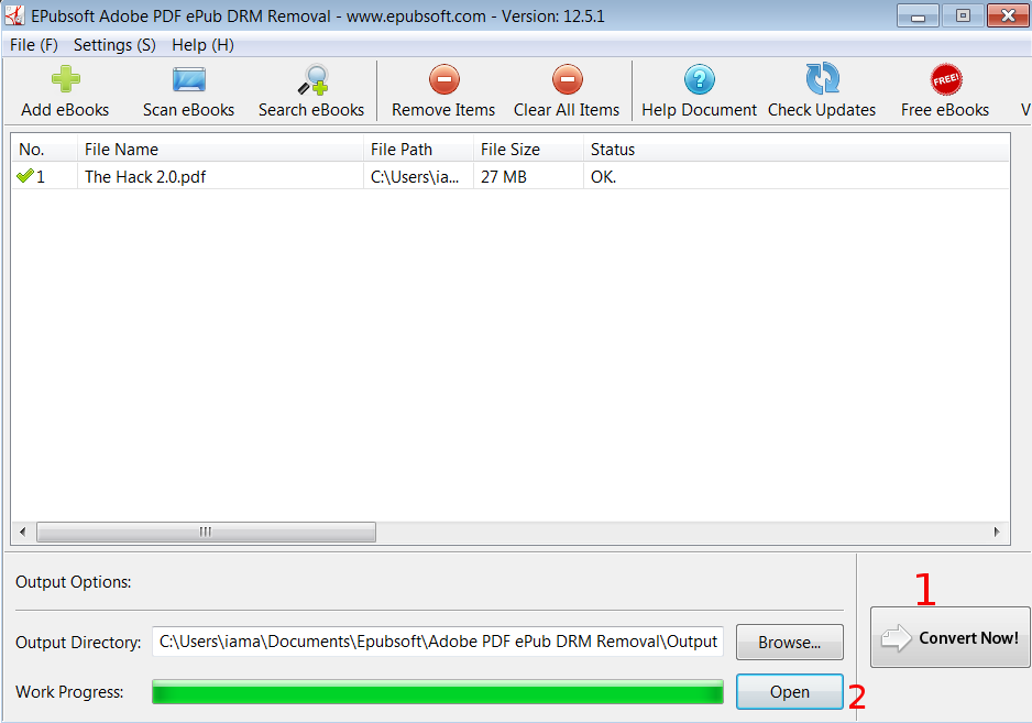 Mở EPubsoft lên và chọn file cần xóa DRM. Việc xóa DRM được thực hiện trong vòng 1 nốt nhạc, chỉ cần click "Convert Now!".