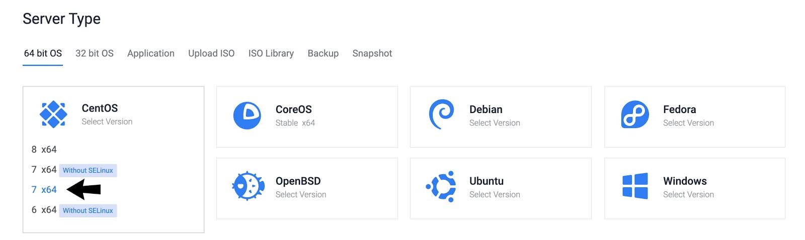Tiếp theo : Server Type . Mọi người bắt buộc phải chọn CentOS 7 x64 ạ :