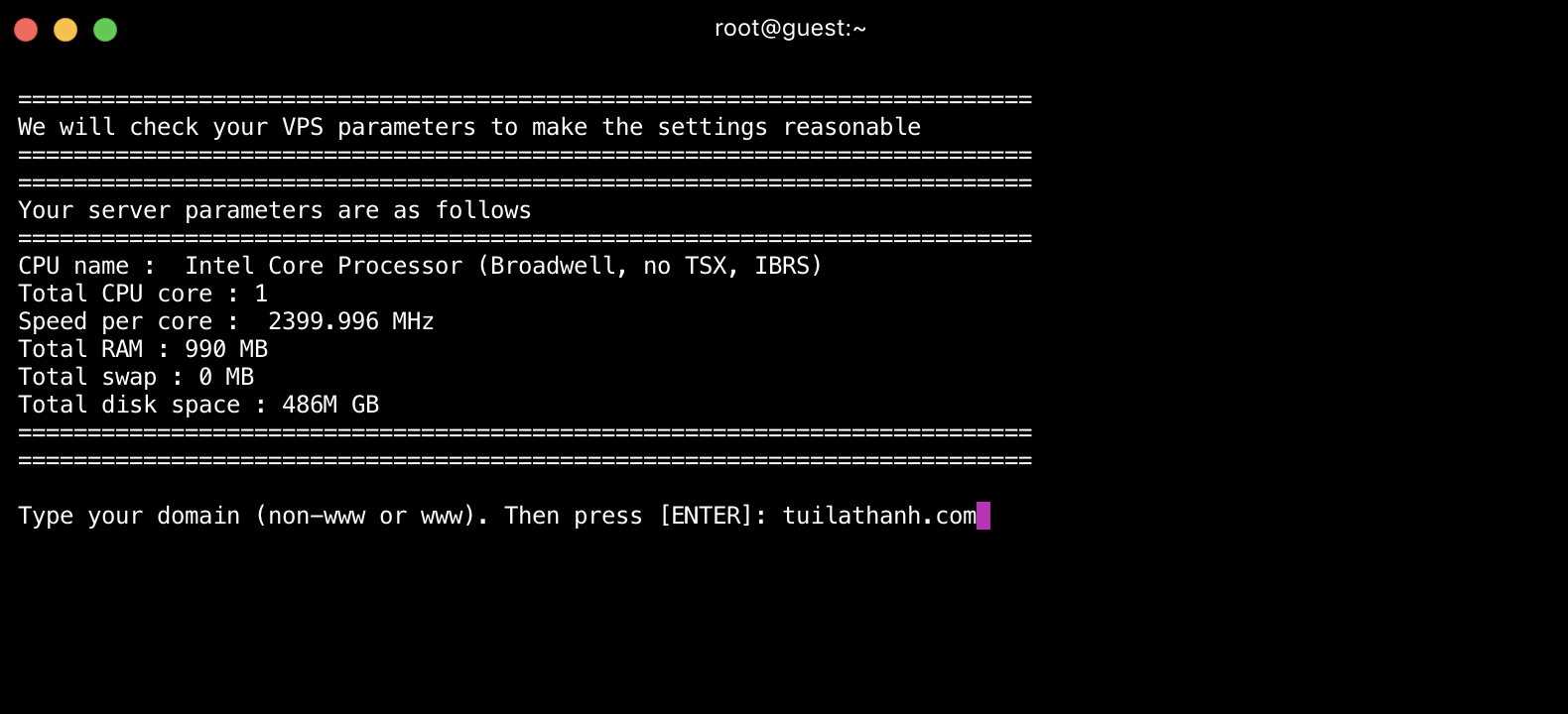 Sau khi Enter : Source code sẽ tiến hành install lên VPS của mọi người , và nó sẽ yêu cầu bạn nhập domain để chạy riêng cho Google Drive Proxy Player Script → như hình dưới : / Mọi người tự chuẩn bị cho mình 1 domain trỏ về IP của VPS nhé /