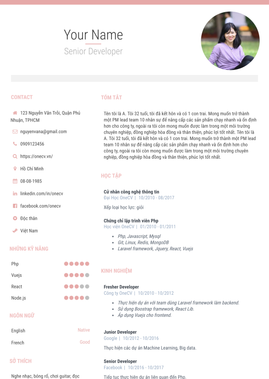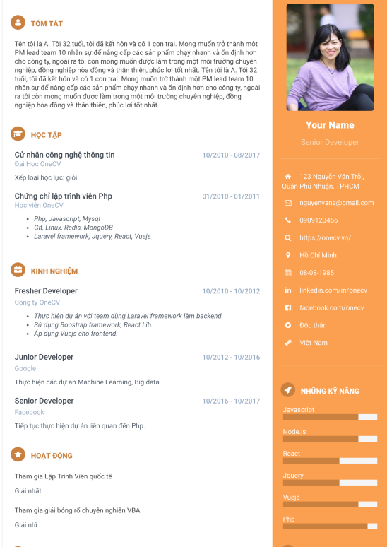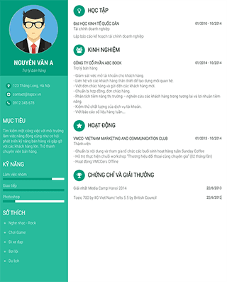 Đây chỉ là những mẫu CV được mình tổng hợp từ các trang web tìm việc dựa theo tiêu chí đủ ý-trình bày đẹp-free của mình, đối với những bạn có yêu cầu cao hơn thì có thể tự design hoặc sáng tạo CV bằng HTML/Bootstrap để thể hiện trình độ . Hiện tại các form CV đều được hỗ trợ viết bằng tiếng Anh, nếu có bạn nào không rành ngoại ngữ thì cũng không có gì đáng lo ngại nhé. Dưới đây mình sẽ up hình form CV cùng nguồn và giới thiệu điểm mạnh của form CV đó. Mẫu CV - Chuyên nghiệp 5 của TopCV Mẫu CV này sẽ thể hiện rõ mọi thông tin liên quan đến bạn, bên cạnh đó CV này có cột tự đánh giá chấm điểm kỹ năng của bạn, bạn có thể thêm vào các điểm mạnh của mình bằng cách cho cột kỹ năng ở mức điểm cao nhất.