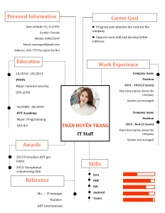 - Thông tin cá nhân: Liệt kê đơn giản họ tên, năm sinh, địa chỉ, email, số ĐT kèm ảnh đại diện nên rõ mặt, nghiêm túc, chất lượng rõ nét, không nên là ảnh selfie. Email cũng cần nghiêm túc và tốt nhất là bằng tên thật của bạn để thể hiện sự chuyên nghiệp.