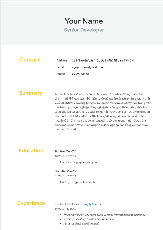 Pro 5 Đây là một trong những form mẫu CV đơn giản nhất phù hợp với các bạn thích style đơn giản nhưng vẫn thể hiện đc đầy đủ thông tin ứng viên của TopDev - một trang tổng hợp kiến thức và tuyển dụng chuyên dành cho dân IT. Điểm hạn chế của mẫu này là nếu bạn nào chưa có nhiều kinh nghiệm nhìn khi sử dụng form CV này sẽ bị "trống vắng" nhiều chỗ.