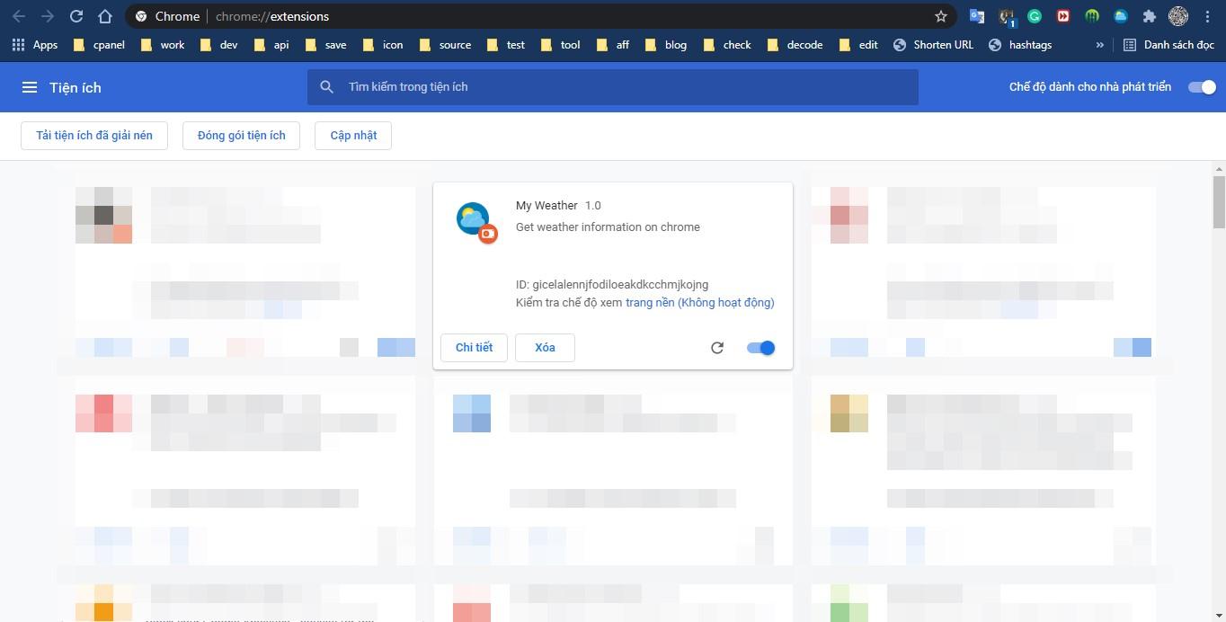 Sau khi xử lý xong, mình để chung thư mục và đóng gói, sau đó bật Chế độ dành cho nhà phát triển của tiện ích trên chrome tại địa chỉ: chrome://extensions/ và mở tới thư mục của extension để hoạt động thôi.