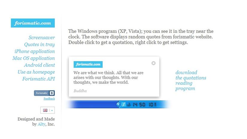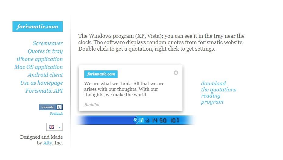 Không chỉ thế, phần mềm còn hỗ trợ làm một công cụ thu nhỏ ở góc màn hình đồng hồ, giúp bạn có thể xem các danh ngôn một cách gọn gàng hơn, bạn có thể tải về và cài đặt thử tại địa chỉ: http://forismatic.com/en/tray-client/ , hỗ trợ win XP, Vista