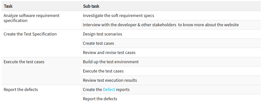 - Work breakdown structure (WBS): Chia test project thành những phần nhỏ