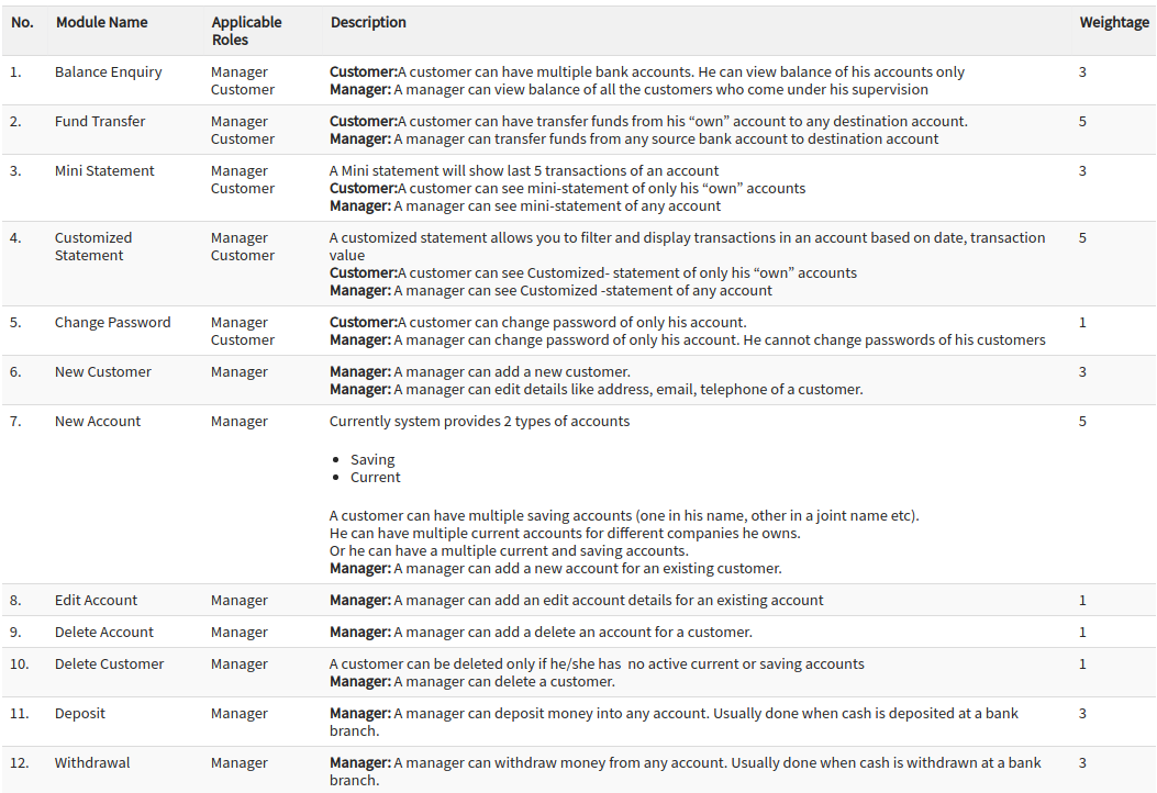 Xem xet một đặc tả phần mềm của website Guru99 Bank ở đây, developer sẽ mô tả chi tiết thành từng module, bạn có thể xác định độ phức tạp của feature bằng cách đóng trọng số cho từng module.