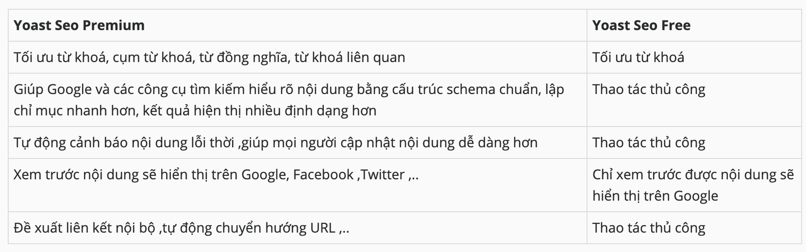 Phần bên trên ,em chỉ nói sơ qua về một số tính năng cơ bản mà Yoast SEO Free mang lại .Tất nhiên với bản ‘xịn’ mọi người chắc chắn sẽ được hưởng những ‘tiết mục thú vị’ hơn .Mọi người có thể nhìn vào bảng so sánh tính năng giữa Yoast Seo Free & Yoast Seo Premium ở dưới đây để có thể có một cái nhìn tổng quan hơn :