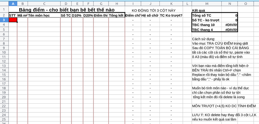 Một sản phẩm thành công không tự nó hiện ra ngay trong đầu của các bạn mà sẽ phải được hình thành từ nhiều lần gọt dũa. Với xuất phát điểm chỉ là một file excel tính điểm trung bình như thế này, việc của người dùng là copy-paste bảng điểm từ trang QLDT của trường vào đây và những công thức có sẵn sẽ tính ra điểm trung bình cũng như số tín chỉ các thứ cho bạn.