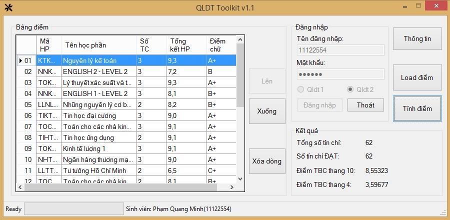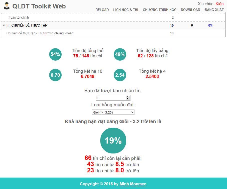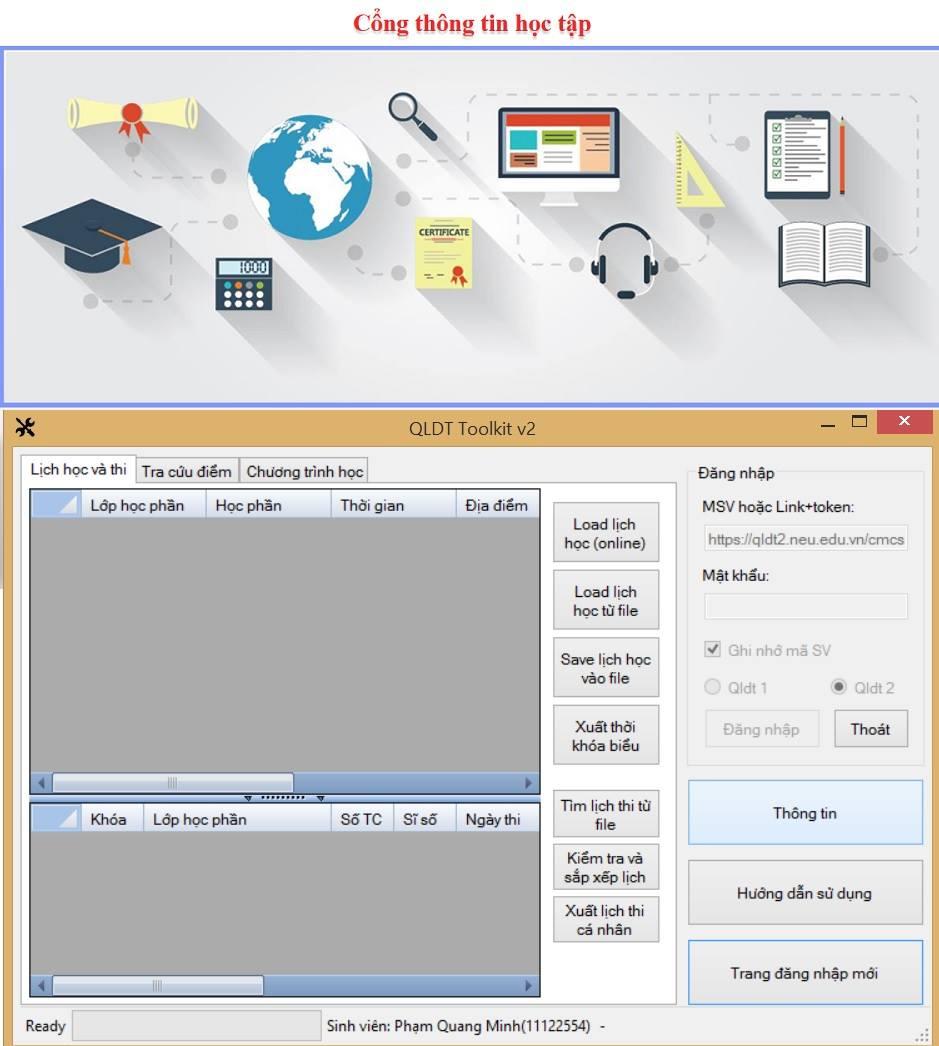 Phần mềm QLDT Toolkit là phần mềm hỗ trợ các bạn sinh viên Kinh tế quốc dân trong việc tính điểm trung bình, tạo ra mục tiêu học tập, sắp xếp lịch học tín chỉ,... mà mình xây dựng khi còn là sinh viên năm 2 NEU. Với hơn 10k người dùng thời đó (trên tổng số sinh viên NEU các khóa đang học ~20k) thì đây là sản phẩm thành công nhất của mình về mặt sản phẩm.