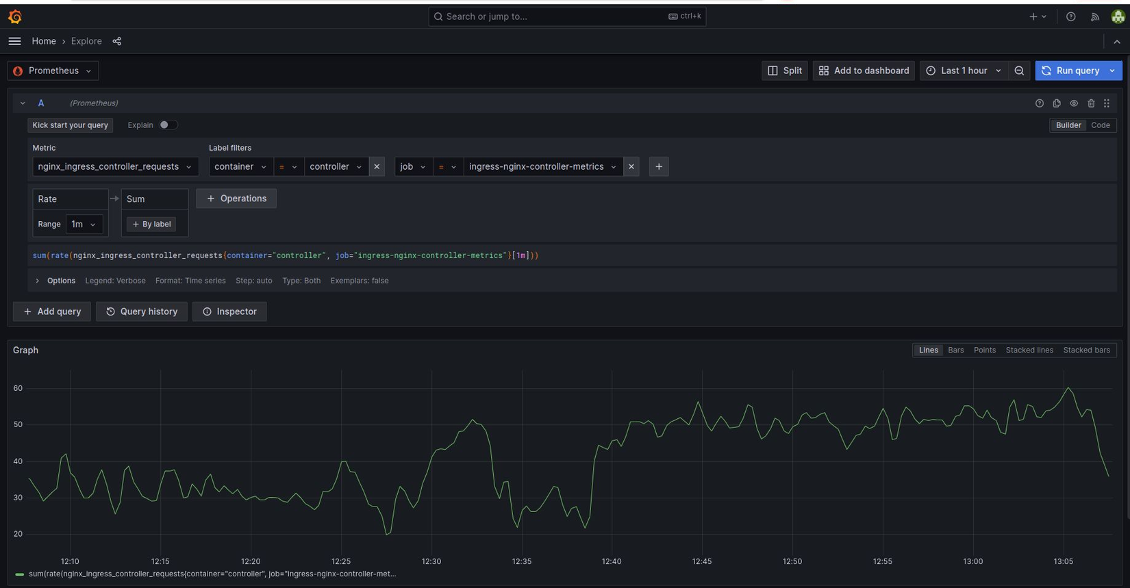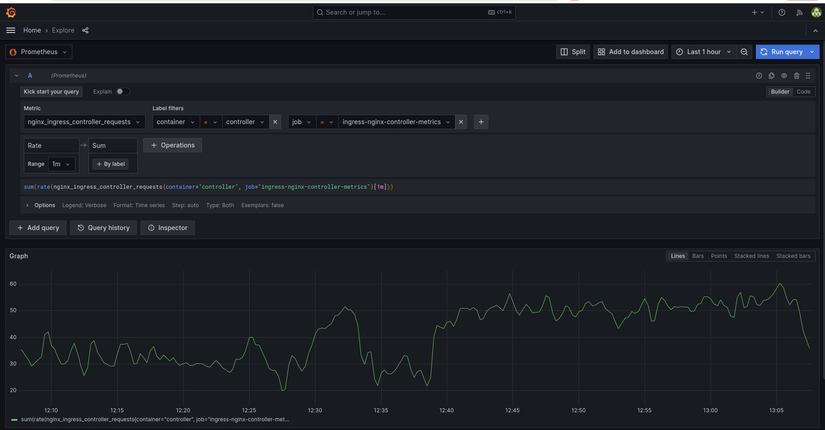 Ví dụ về PromQL: sum(rate(nginx_ingress_controller_requests[1m])) by (ingress)