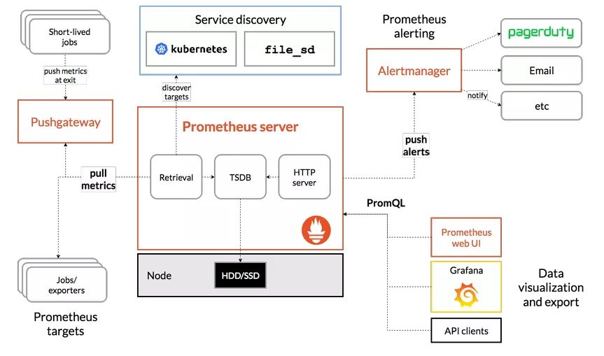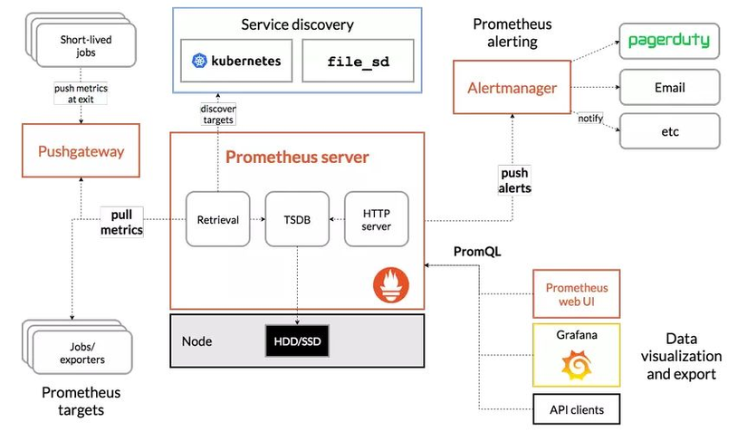 Prometheus Là một hệ thống mã nguồn mở, sử dụng để giám sát dựa trên các số liệu. Nó thu thập dữ liệu từ các service và host. Dữ liệu sau đó được lưu trong cơ sở dữ liệu chuỗi thời gian (time-series database).