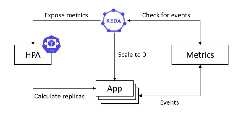 HPA có thể mở rộng theo một số metrics (Prometheus, API, ...). Kubernetes event-driven autoscaler (KEDA) hoạt động với vai trò như một Metric Server biên dịch các metric nhận được từ external server về cấu trúc mà HPA có thể hiểu được để tiến hành mở rộng thông qua HPA. Tìm hiểu thêm: https://keda.sh/.