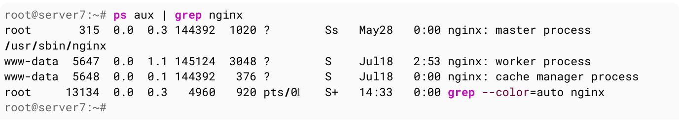 Nhìn trên ví dụ, cột thứ hai là id process. Nếu bạn muốn loại bỏ quá trình nginx, bạn có thể sử dụng command kill 5647