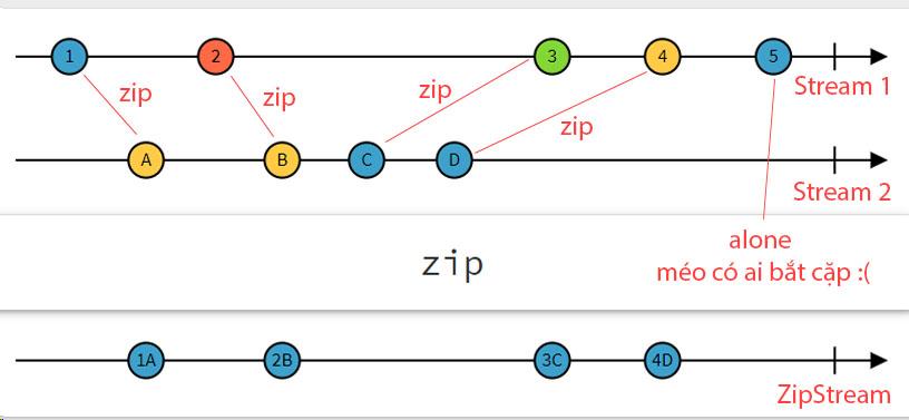 Nhìn vào ảnh có thể hiểu có 2 Stream là Stream 1 và Stream 2 chạy song song, 2 Stream này cũng được merge lại thành 1 ZipStream.