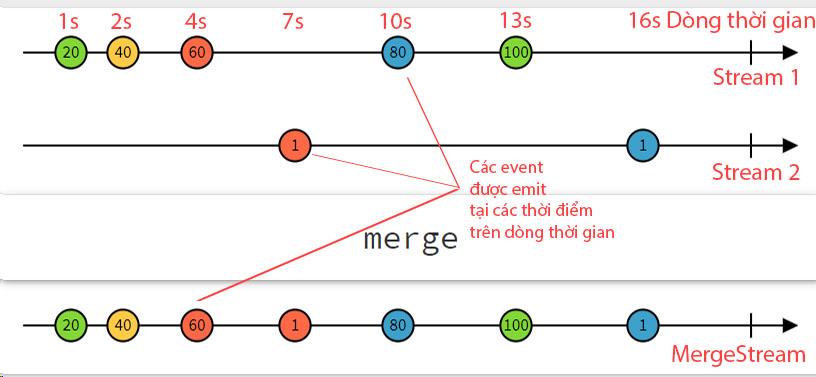 . Ở đây ta có 2 stream gọi là Stream 1 và Stream 2 chạy song song nhau và 2 stream đó được merge lại thành 1 MergeStream, các event trong MergeStream được emit theo thứ tự đúng y hệt dòng thời gian của Stream 1 và Stream 2. Thực tế bạn thích truyền bao nhiêu Stream vào MergeStream để merge lại cũng được. Ở đây mình sẽ merge 2 stream lại bằng cách dựng code giống hệt cái ảnh trên cho các bạn dễ hiểu.