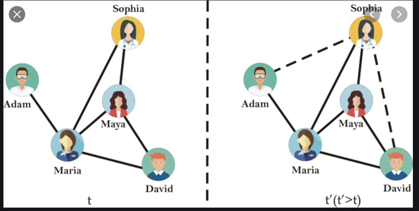 - Và thuật toán prediction link mình tạm gọi dự đoán mối quan hệ thì có một ví dụ như hình dưới đây