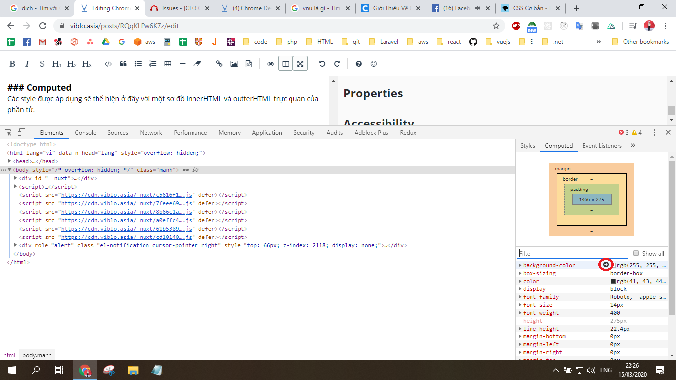 - Phần tool: các element.style, các sự kiện trên element, các thông tin được áp dụng cho thẻ, các thuộc tính của thẻ,..
