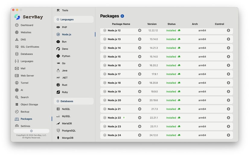 Nếu bạn không muốn làm rối tung máy local với hàng đống cấu hình chỉ để test thử, hoặc đơn giản là thấy việc setup môi trường quá phiền phức, hãy thử ServBay. Nó giúp bạn triển khai môi trường Node.js chỉ với một cú click, tự động xử lý cấu hình đường dẫn và quản lý phiên bản.