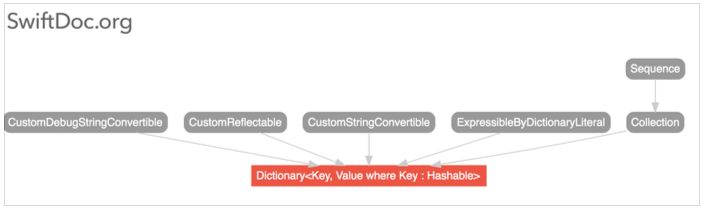 Trong phần này chúng ta dùng protocol để định nghĩa những yêu cầu cho những thành phần của robot. Bây giờ đến lượt bạn, bỏ ít thời gian để xem nếu bạn có thể tạo một phần thực thi của Robot protocol mà không tạo bất cứ phần thực thi cứng ngắt nào của những protocol khác. Điểm mấu chốt để hiểu protocol là hiểu cách để dùng chúng mà ko cần phần thực thi thoã mãn chúng. Tiếp theo chúng ta sẽ xem cách apple dùng protocol trong thư viện của họ Apple dùng protocols một cách chuyên sâu trong thư viện swift của họ. Tài nguyên tốt nhất để thấy điều này là trang http://swiftdoc.org Để xem cách apple dùng protocol hãy cùng xem kiểu Dictionary. Kiểu này rất phổ biến nhưng cũng là một trong những kiểu có cấu trúc protocol đơn giản.