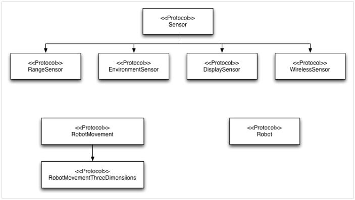 Đây là protocol định nghĩa 3 thuộc tính, 1 hàm khởi tạo và hai phuơng thức sẽ cần để thực thi bởi bất cứ kiểu dữ liệu nào muốn thoã mãn protocol này. Những yêu cầu này sẽ cho chúng ta những chức năng cơ bản cần thiết cho robot Có thể có chút bối rối trong việc suy nghĩ về tất cả những protocol này Đặc biệt nếu chúng ta dùng một vài superclass. Nó thường giúp ta có bản đồ cơ bản về protocol của mình