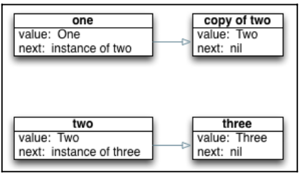 Như bạn có thể nhìn thấy trong hình. Thuộc tính next của thực thể one đang chỉ tới một bản sao của thực thể two, mà giá trị next của bản sao thực thể two này đang là nil. thuộc tính next của thực thể two thật đang chỉ vào thực thể three. Điều này có nghĩa là chúng ta cố gắng duyệt từ thực thể one thì chúng ta sẽ ko thể đến dc thực thể three.