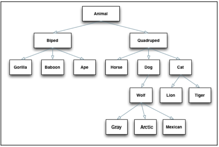 Trong lớp Dog chúng ta kế thừa từ lớp Quadruped cái mà kết thừa từ lớp Animal. Do đó lớp Dog sẽ có tất cả các thuộc tính , phương thức và đặc điểm của cả lớp Animal và lớp Quadruped. Nếu lớp Quadruped ghi đè bất cứ thứ gì từ lớp Animal, sau đó lớp Dog sẽ kết thừa lại phiên bản đã có của lớp Quadruped. Chúng ta có thể tạo ra một cấu trúc phân lớp phức tạp trong hoàn cảnh này. Như một ví dụ, theo như đồ thị mở rộng trên cấu trúc phân lớp chúng ta vừa tạo để thêm một số lớp nhỏ khác