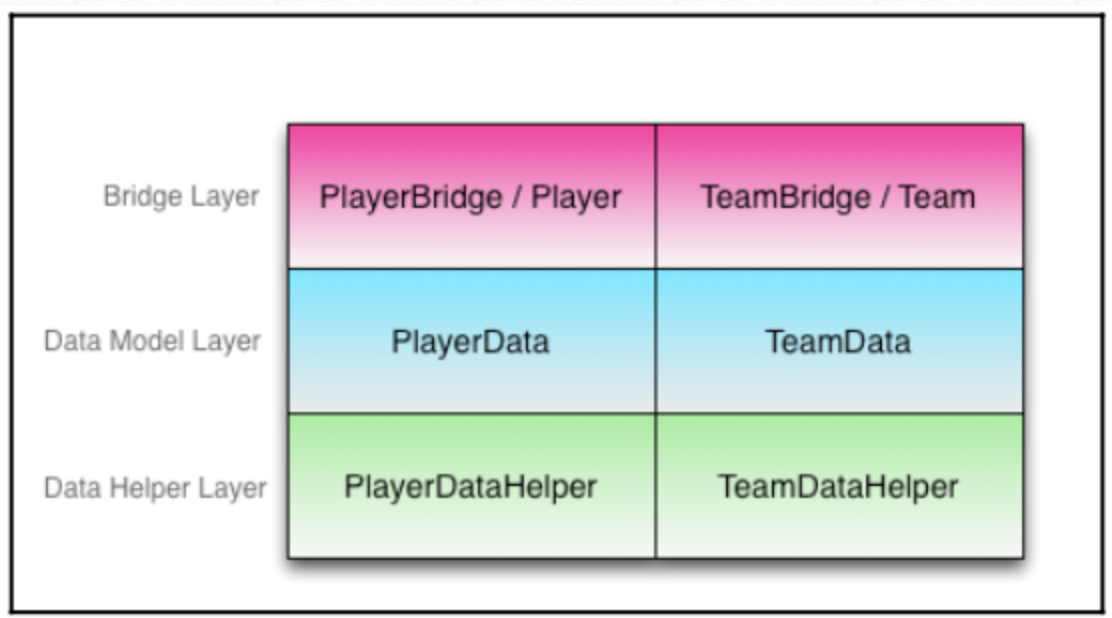 Ý tưởng về tầng truy xuất dữ liệu, dữ liệu (PlayerData và TeamData) và data helper (PlayerDataHelper và TeamDataHelper) những kiểu này là cặp từ trong logic của ứng dụng. Nếu bạn xem qua phần mẫu thiết kế chúng ta đã thảo luận ở chương trước. Chúng ta sẽ thấy mẫu Bridge có thể dùng được ở đây. Cùng xem cách chúng ta sẽ dùng mẫu bridge để tạo ra một sự phân lớp tốt giữa tầng truy xuất dữ liệu và code của ứng dụng.