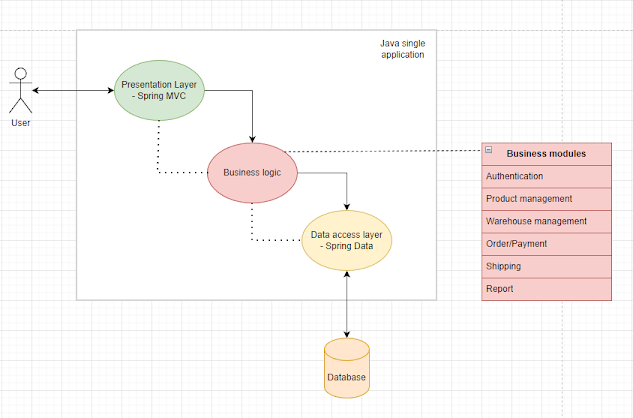 Cùng xem xét một ứng dụng monolith truyền thống với các tier Presentation, Business logic và Data access layer.