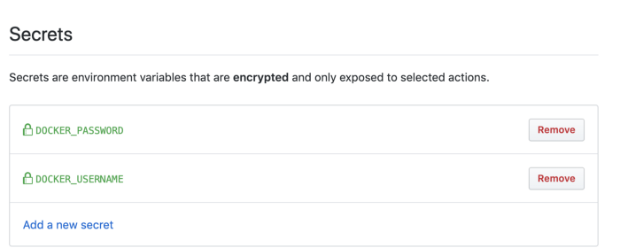 dòng 25-29: Dòng này là đăng nhập vào Docker hub. Ở đây chúng ta sử dụng các secrest key được chuyển dưới dạng biến env cho bản biuld. Chúng ta có thể đặt các biến env này theo nhiều cách. Để thiết lập điều này qua GitHub, hãy đi tới Settings-> Secrets và tạo key mới