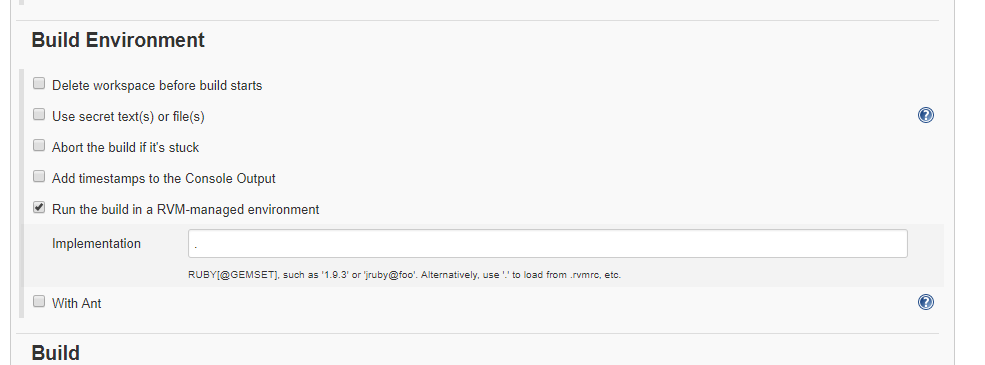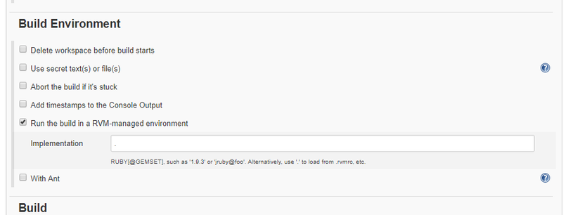 - Chọn Build Environment -> chọn Run the build in a RVM-managed environment -> giá trị là