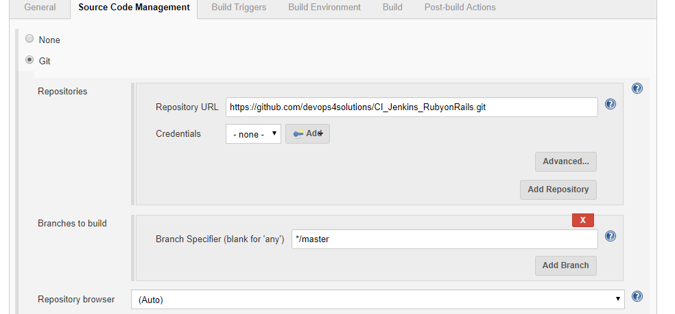 - Tạo một freestyle Project -> chọn Source Code Management -> chọn Git - https://github.com/devops4solutions/CI_Jenkins_RubyonRails.git