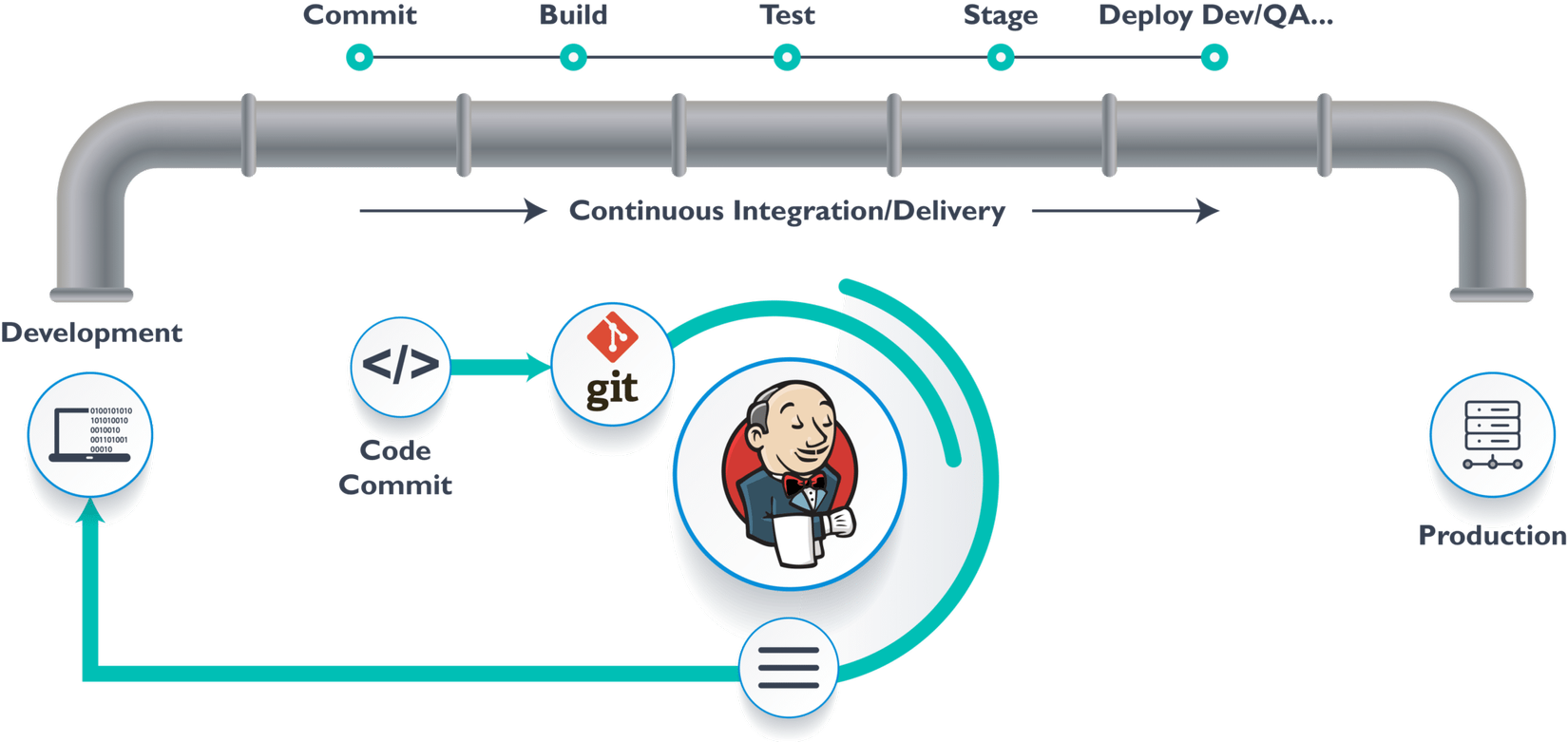 Nhiệm vụ của ta là tự động hóa toàn bộ quá trình, từ lúc đội phát triển push code lên hệ thống quản lý phiên bản đến khi code được deploy lên production. Để thực hiện điều đó, ta cần một công cụ tự động.