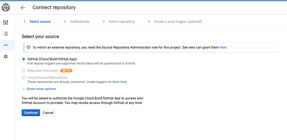 Chú ý: Để có thể connect đến một repo private, cần thêm các config trong file cloudbuild.yaml. Xem hướng dẫn chi tiết tại link dưới: https://cloud.google.com/cloud-build/docs/access-private-github-repos