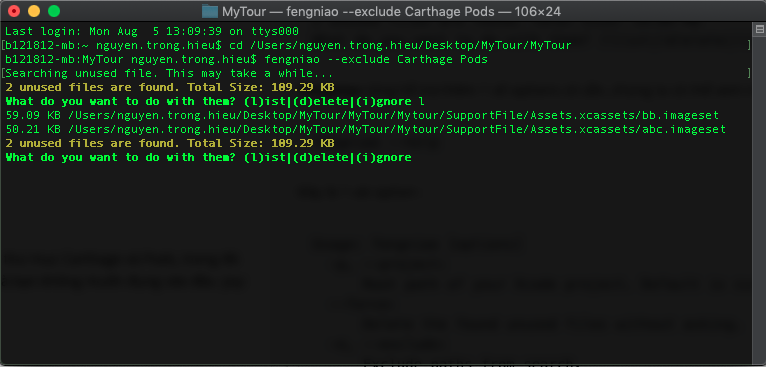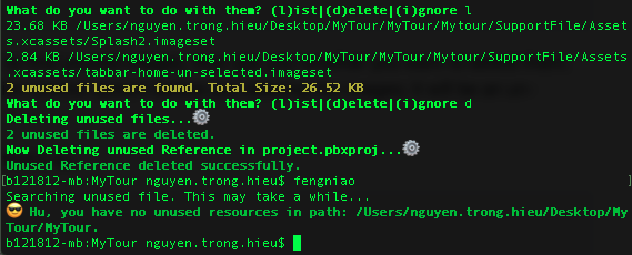 Như các bạn thấy thông báo hiện lên và nó báo đã xoá 2 file đó thành công khỏi project, chạy lại câu lệnh "fengniao" để xem và kết quả là project của chúng ta đã clean hoàn toàn rồi, thật tuyệt vời phải không nào