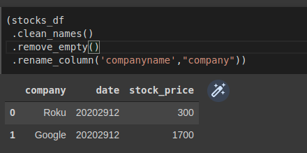 Đổi tên columns trong pyjanitor, ở đây mình đổi companyname thành company: