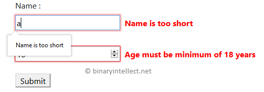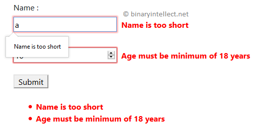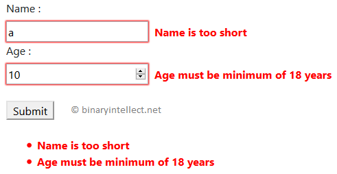 Bây giờ ta chạy ứng dụng và điền một số giá trị không hợp lệ trong cả hai textbox. Bạn nên thấy custom error message như bên dưới: