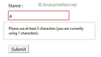 Form bao gồm 2 textbox và một button. Cả hai trường input đều sử dụng các attribute của HTML5 như readonly, minlength, and maxlength để validate input. Bất kỳ khi nào có lỗi về validate thì một custom error message sẽ được hiển thị bên cạnh input. Một list tất cả error message trong form được hiện thị ở cuối của trang.